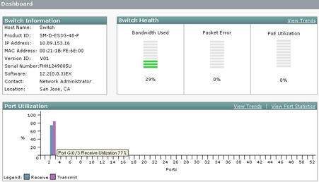 The Dashboard provides information about the switch and is the main window for monitoring the switch status and its performance. It is the default window and appears each time that you display the device manager. For more information about the gauges, indicators, and graphs, see Dashboard.