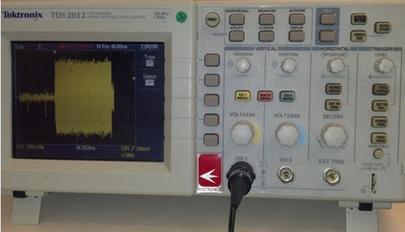- Set Channel 1 to AC coupling, SEC/DIV to 25 msec per division, and VOLTS/DIV according to the HLGT amplitude. Using the TRIG Menu button, set the trigger source to CH1 and Normal.