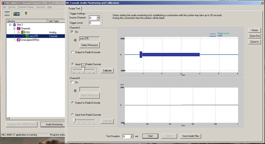 - To calibrate the input from the console to the MLC 8000 Analog Comparator (VGU), press PTT on your console and measure the power of the High Level Guard Tone (HLGT) signal with the Oscilloscope. The nominal level of HLGT should be -4 dBm with a variance of –22.5 to 15 dB. For values outside of this range, check your setup.