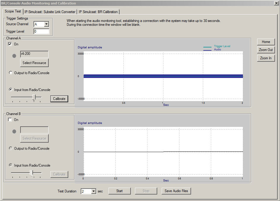 If no signal is displayed, the BR/Console Audio Monitoring and Calibration window appears as follows: