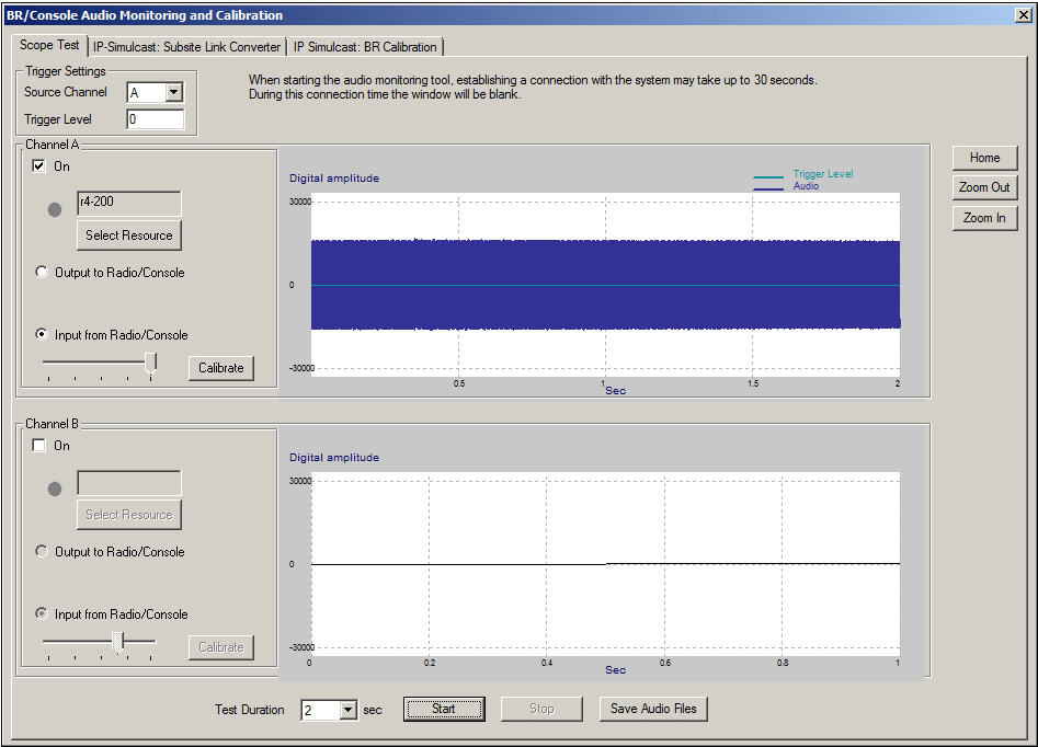 - If a full scale signal displays in the BR/Console Audio Monitoring and Calibration window, adjust the Input From Radio/Console slider and click Start to resume audio monitoring.