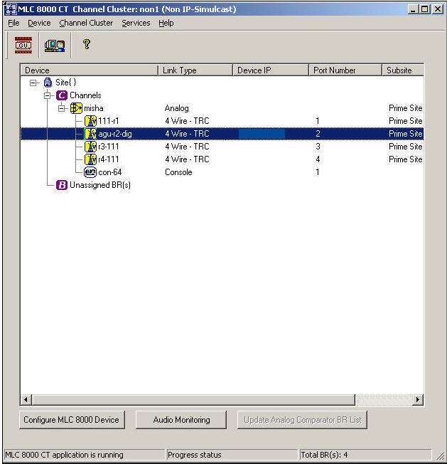 Adding a comparator (MLC 8000 Analog Comparator (VGU), GRV 8000 Digital Comparator, GCM 8000 Digital Comparator, or Mixed Mode Comparator) to the channel cluster causes the device to appear under the Channels branch. A maximum of four comparators can be associated with a channel cluster. Each comparator in the cluster can be connected to up to 64 BRs as long as the total number of AGU ports associated with all the VGUs in a single channel cluster does not exceed 64 AGU ports. If an AGU port is connected to a comparator, then it must be a comparator from the channel cluster. Each VGU is displayed with a console (even if in the real system the console does not exist). This association is for practical reasons, to enable audio monitoring on the link between the VGU to the console. Adding an MLC 8000 Subsite Link Converter (AGU) to a channel cluster causes the four ports of this AGU to display under the Unassigned BR branch initially. After each port of the MLC 8000 Subsite Link Converter (AGU) is associated with a particular channel, the base radios connected to the port display as attached to the associated comparator (analog, digital, or mixed mode). You can right-click the comparators and base radios in the channel cluster tree and then a submenu is opened to allow you to configure that device. You can monitor the console by clicking it and then selecting the audio monitoring button at the top of the display.Display of Comparators in the Channel Cluster Tree