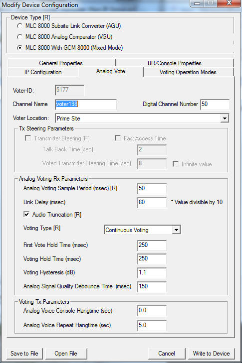 Modify Device Configuration Window – Analog Vote Tab for a VGU in a Mixed Mode System