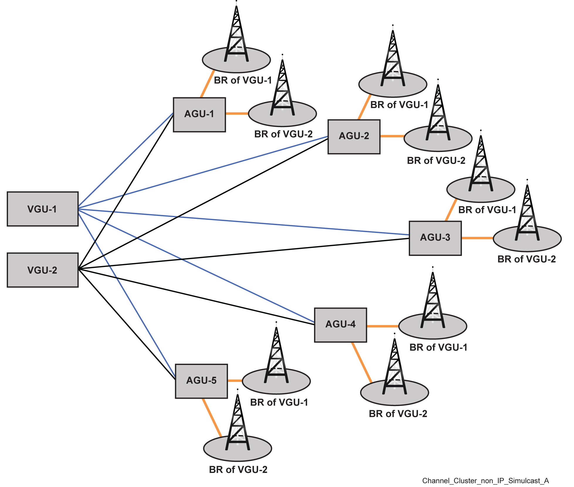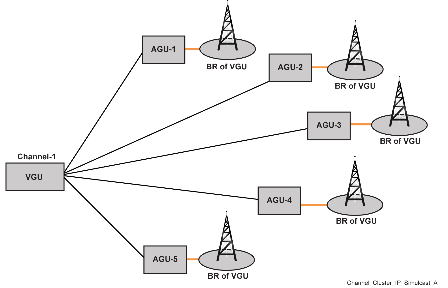 The following figures show an example of an and an example of a non IP simulcast channel cluster. Note the IP simulcast channel cluster contains a single channel while the shows two channels and the MLC 8000 Subsite Link Converters (AGUs) serving both channels.