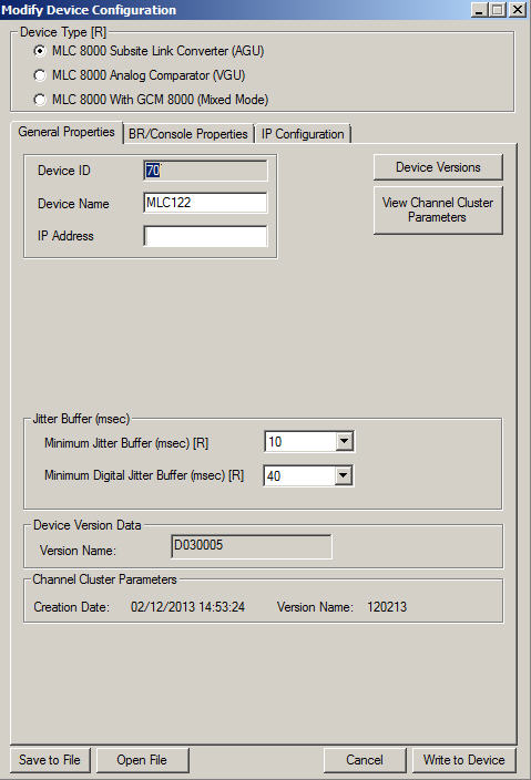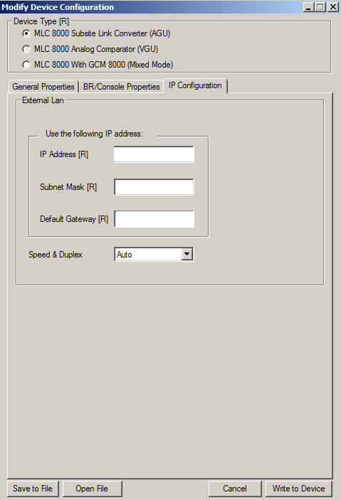 - Verify that in the Device Type field, MLC 8000 Subsite Link Converter (AGU) is selected.