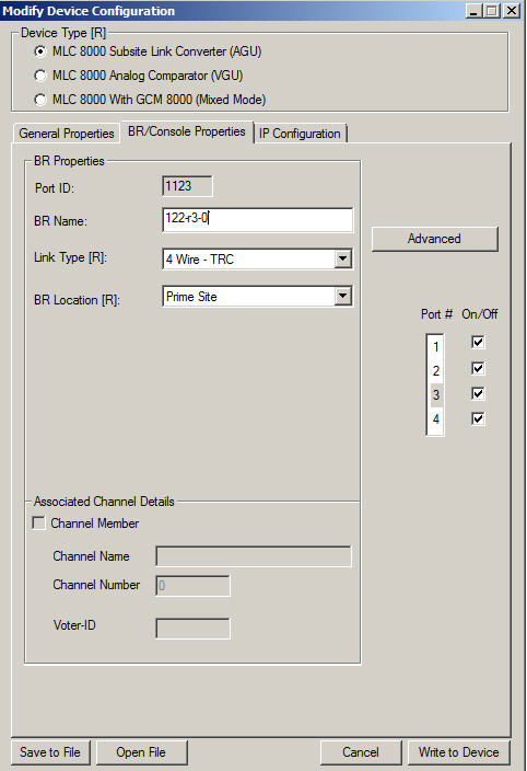Modify Device Configuration Window – BR Advanced Main Tab for an AGU in a Non IP Simulcast System
