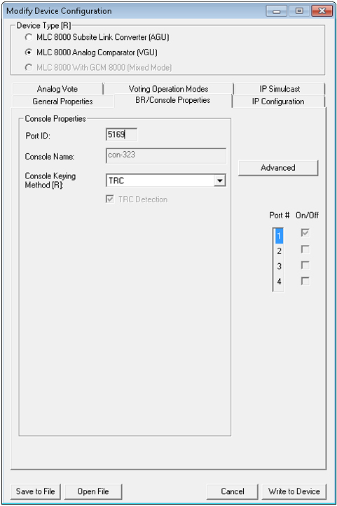 Modify Device Configuration Window – BR/Console Properties Tab for a VGU in an IP Simulcast System