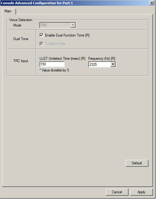 - In the Dual Tone field, select Enable Dual Function Tone if dual function tone should be enabled, meaning that TRC signaling from the console to the radio contains two function tones. If this field is not selected, dual function tone is disabled and signaling from the console to the base radio contains one function tone.