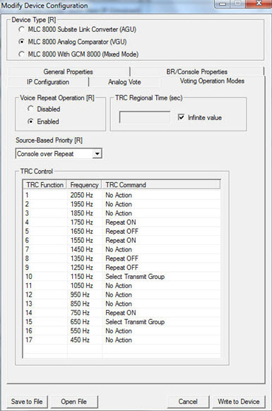 - TRC Regional Time (sec): While in TRC Transmitter Steering mode (from the Console Frequency Select), started when the dispatchers and radios have de-keyed, and canceled when audio is received from a dispatcher or a radio within the selected region. If expired, the TRC Transmitter Steering mode is de-activated and Voted Transmitter Steering is applied. The TRC Regional Time is only valid when Transmitter Steering is enabled and the Voting Type is Regional Voting. Values range between 0-100000 in increments of 1 sec. Default is Infinite.