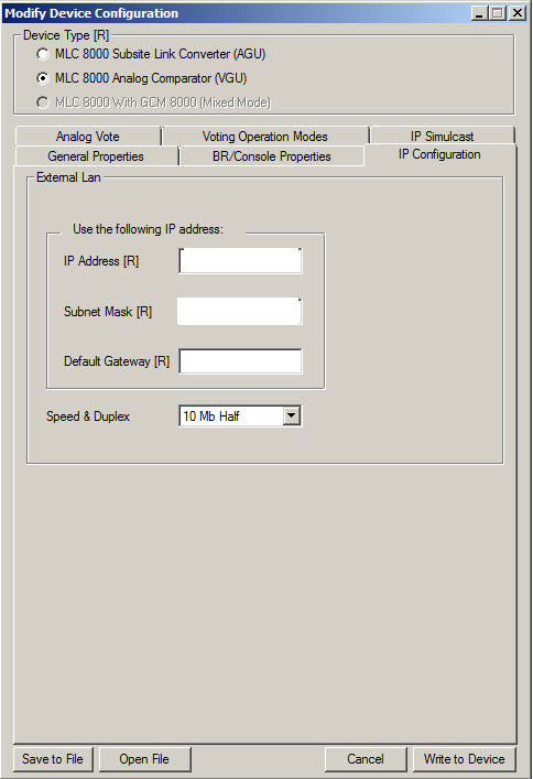 - Verify that radio button MLC 8000 Analog Comparator (VGU) is selected as the device type in the Device Type field at the top of the window . If not already selected, click MLC 8000 Analog Comparator (VGU).