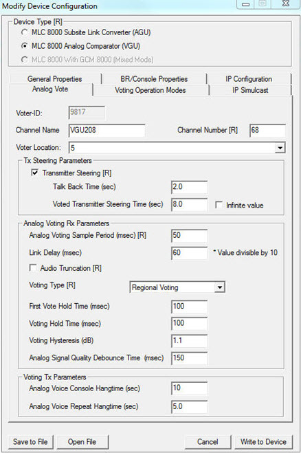 Modify Device Configuration Window – Analog Vote Tab for a VGU in an IP Simulcast System