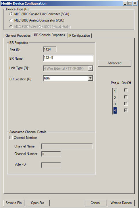 Modify Device Configuration Window — BR Advanced Main Tab for an AGU in an IP Simulcast System
