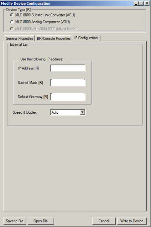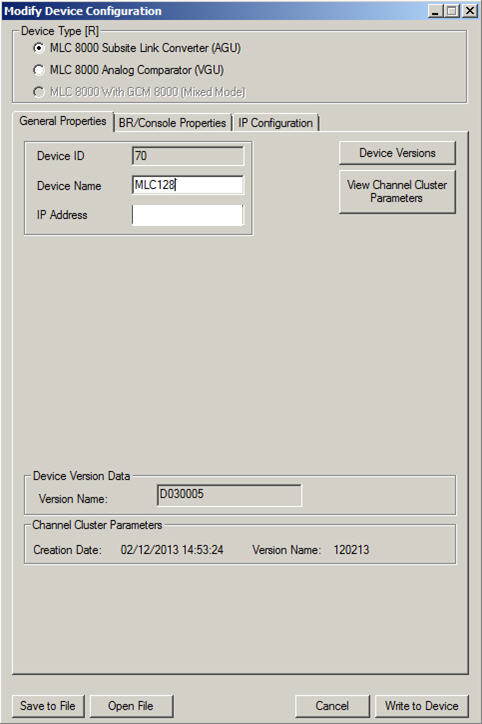 - Verify that in the Device Type field, MLC 8000 Subsite Link Converter (AGU) is selected.