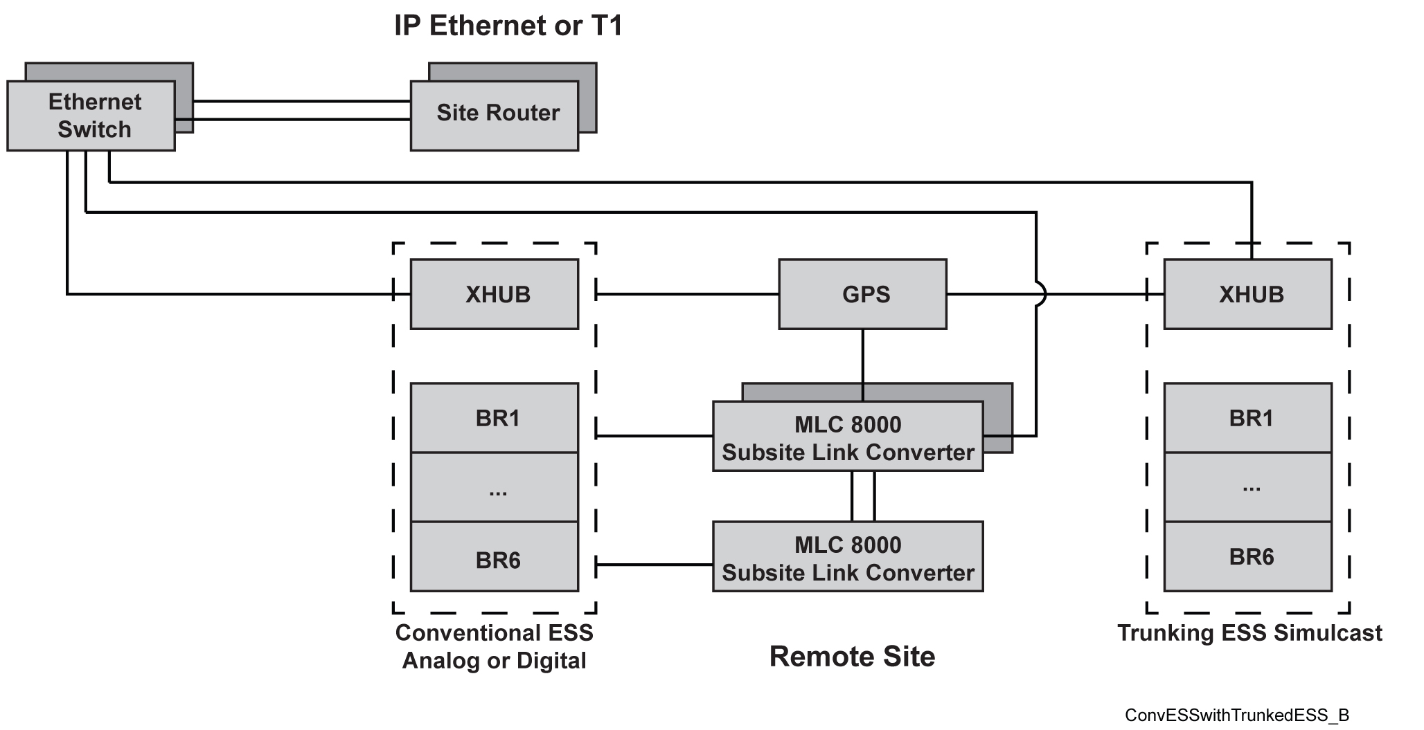 MLC 8000 Analog Comparators, MLC 8000 Subsite Link Converters, and conventional base radios supporting Ethernet-based digital, analog, or mixed mode channels can be deployed at an ASTRO® 25 trunked site, where the conventional system shares the transport equipment, and timing and frequency reference devices when capacity is available. Trunked RF site (repeater or simulcast) cabinet equipment, as well as transport equipment and timing equipment, can be shared between conventional and trunked channels.
