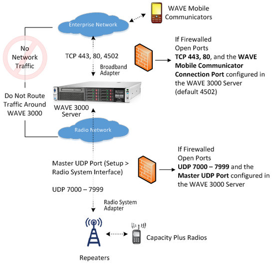 If the Enterprise network can communicate directly to the Capacity Plus system, then the WAVE 3000 Server may (depending on configuration) attempt to use the Enterprise network to communicate with the Capacity Plus system. This configuration can result in loops, degradation of audio, doppelgangers, disconnections, and other problems. Ensure the Enterprise network remains isolated from the Capacity Plus network. All traffic from the Enterprise network must route through the WAVE 3000 Server.