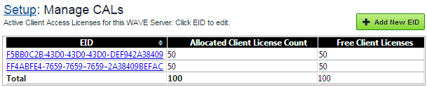 The Manage Client Access Licenses (CALs) page opens and displays a list of all EIDs currently associated with this WAVE 3000 Server.
