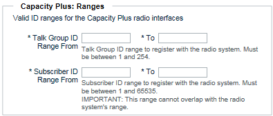 A. In Talk Group ID, enter the start and end range of Talk Group IDs to register with the Capacity Plus radio system. All specified IDs in the range will attempt to register with the radio system. This range includes both radio and WAVE IDs. The range you specify must include the Talk Group IDs in the radio system. The WAVE 3000 Server will prevent you from creating Talk Groups outside this range. Talk Groups you create for broadband-only do not include a Talk Group ID. This is explained further when you create a Talk Group.