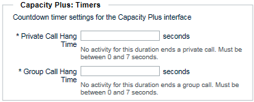 A. In Private Call Hang Time, enter the amount of time in seconds required to terminate a Private Call. This value should match the Private Call Hang Timer specified in the Capacity Plus system. Each Private Call transmission between a radio and a broadband client resets this timer. Once the timer expires, the Private Call session is terminated and all resources are freed.
