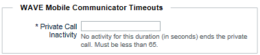 In Private Call Inactivity, specify the call timeout in seconds. This applies to all Private Calls between broadband-to-broadband or radio-to-broadband. If no communication occurs over this duration during a Private Call, then the broadband client times-out and disconnects the Private Call Session.