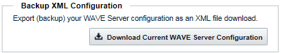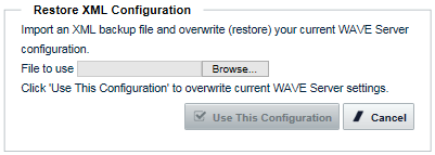 The WAVE 3000 Server Backup or Restore Configuration page allows you to backup and/or restore the WAVE 3000 Server configuration file.