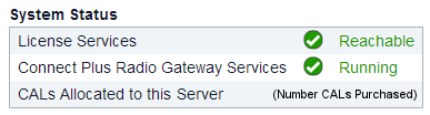 Indicates a connection to the Licensing Server. A valid connection does not indicate that your WAVE 3000 Server is correctly licensed. If your WAVE 3000 Server’s ID is not present in the Licensing Server, an error still appears in the System > Manage CALs page. Connection to the Licensing Server occurs over port 80. If this port is blocked, then License Services indicates