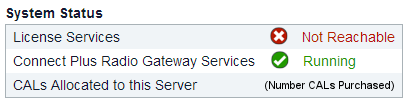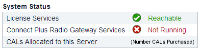 Indicates the status of the WAVE 3000 Server software services. Connect Plus Radio Gateway Services should always display Running. If it displays Not Running, then the WAVE 3000 Server software has encountered an error.