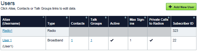 This is the integer ID value that identifies the user. The WAVE 3000 Server uses Subscriber IDs to connect LMR > BB and BB > LMR Private Calls. The WAVE 3000 Server also uses Subscriber IDs to identify WAVE users to radio users. The range for Subscriber IDs is set in the Setup > Radio System Interface page. WAVE users without a Subscriber ID are identified using the Anonymous User ID set in Setup > Radio System Interface > Anonymous User. WAVE users without a Subscriber ID are unable to receive LMR > BB Private Calls.