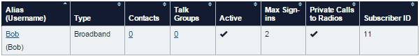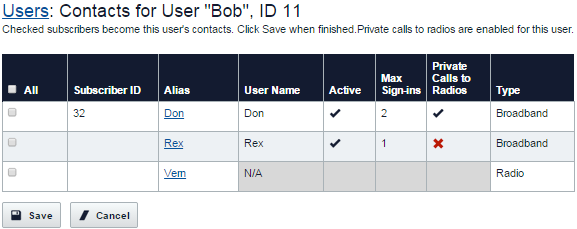 The Users: Contacts for Subscriber page opens.