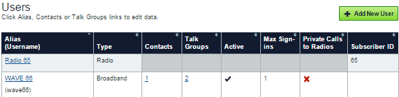 Adding Contacts for Private Calls Control over the ability of a user to initiate Private Calls to other users occurs on the Contacts page for each user. The users listed in any given users Contacts page represent those users that this user can call. Users may receive calls from those users not listed in their contact list, but cannot initiate them. For example, Bob has John listed in his Contact list, but John does not have Bob in his Contact list. Bob can call John, but John cannot call Bob. To give John the ability to call Bob, add Bob to John’s contact list. Connect Plus radio users do not have a Contact list in the WAVE 3000 Server. To add a contact to a user’s Contact list 1. Sign in to the WAVE 3000 Server, and then click the Users tab.The Users page opens. 2. Under the Contacts column, click the Contacts link for the WAVE user to modify.The Users: Contacts for Subscriber page opens. 3. In the All column, select the users that this user can call, or select All to add all users. 4. Click the Save button. 5. Click Commit Changes when you are ready to activate the change. To continue setup, follow the instructions in Committing Changes.