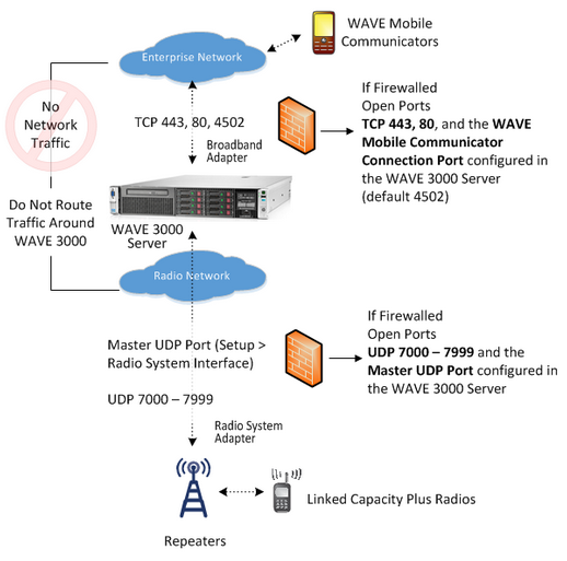 As listed in the diagram and in the instructions, ensure the appropriate ports are opened for the WAVE 3000 Server unit if a firewall exists between the Enterprise Network and the WAVE 3000 Server, or between the WAVE 3000 Server and the Link Capacity Plus radio system.Broadband-only Talk Groups do not integrate with the radio system. Only WAVE clients can use broadband-only Talk Groups. The Supports Radios selection is available when you create or edit a Talk Group in the WAVE 3000 server. Clearing this field creates a Broadband-only Talk Group.