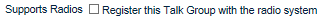 Note: The Supports Radios selection is cleared by default. Select Supports Radios to create Talk Groups for use between WAVE and radio users.
