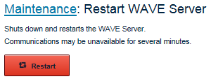 Restarting the WAVE 3000 Server If the WAVE 3000 Server system is operating sluggishly, and users are experiencing latency, you may want to restart the WAVE 3000 Server service. Restarting causes a full reboot of the WAVE 3000 Server unit. Important: During the restart, all WAVE broadband clients are logged out and cannot sign in until the restart completes. WAVE users attempting to sign in at this time receive an error message. WAVE users that were logged in when the process started will be logged out and their clients will continue to attempt to log back in until the system is available, at which time they will automatically log back in. The amount of time required to restart may vary. Radios will continue to operate as normal, but cannot communicate with WAVE broadband clients. To restart a WAVE 3000 Server 1. Sign in to the WAVE 3000 Server system. 2. Click the Maintenance tab. 3. Click the Restart WAVE Server link. 4. In the Restart the WAVE Server System area, click the Restart button. 5. Click OK to verify.The system restarts. All users are logged out. A communication delay occurs while the system reboots.