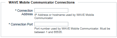 A. In Connection Address, enter the IP address or the host name of the server used by WAVE Mobile Communicator clients to connect to the WAVE 3000 Server. This is the address WAVE users must enter when they sign in.