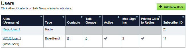 Note: Click the Type header to sort by type. This makes it easier to identify Broadband users. Radio users are associated with Talk Groups on the Linked Capacity Plus Radio System.