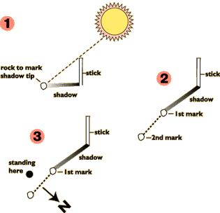 Shadow Tip Find a straight stick about a meter long and locate a level spot with no brush in which a shadow will be cast. Place the stick in the ground and mark the shadow's tip. Wait 10-15 minutes until the shadow tip moves a few centimeters and mark the shadow tip's new position. Then draw a line through the two marks to obtain an approximate east-west line. The first mark will always be west. Stand with the first mark (west) to your left and the second mark to your right. You are now facing north. Using