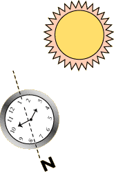 a Watch If you have a watch with hands, it can help you find your way. The direction will be accurate if you are using a true local time with no changes for daylight savings time. Also, the further you are from the equator, the more accurate this method will be. If you have a digital watch, all is not lost. Just draw a circle on a piece of paper with the correct time shown. Assuming you are in the northern hemisphere, hold the watch horizontal and point the hour hand at the sun. Bisect the angle between the hour hand and the 12:00 mark to get a north - south line. If you have trouble deciding which end of the line is north, remember that the sun rises in the east and sets in the west. It is due south at noon, east before noon, and west after noon. Note: If your watch is set on daylight savings time, use the midway point between the hour hand and the 1:00 mark to determine the north - south line. The Night Sky