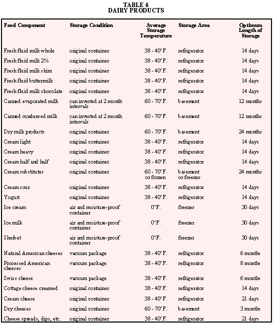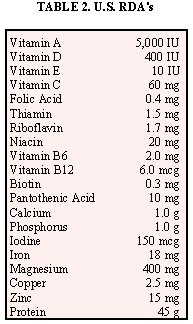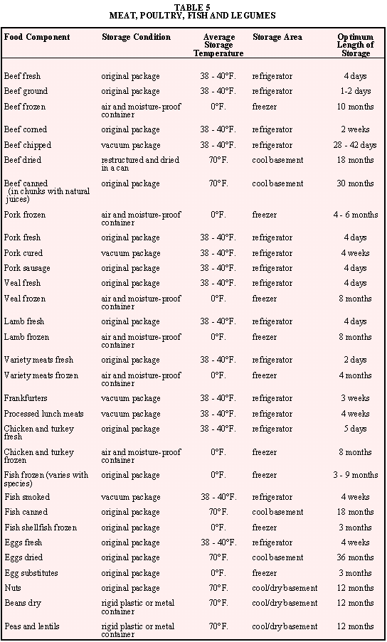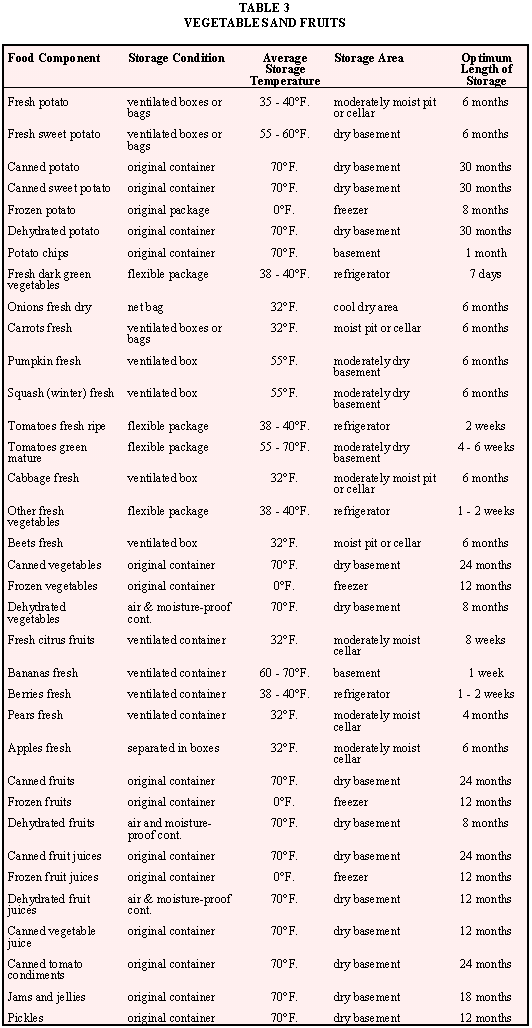 Since the human body is about 65 percent water we must consider it as an important nutrient. Rubner, a German physiologist, found that during starvation an animal can live if it loses nearly all the glycogen and fat, as well as half the body protein, but a loss of 20 percent of the water in the body results in death. One can live without food for over a month, but without water only a few days. Sources of water for our bodies come from l) fluid foods in the diet, 2) solid foods in the diet, and 3) water produced in the body resulting from metabolism of energy nutrients. Water is lost from the body by way of the kidneys (urine), skin (perspiration), lungs (expired air), intestinal tract (feces), and eyes (tears). (See Table 1.) A reasonable recommendation for water consumption per day would be a tablespoon for each 15 calories of food. A 2,200 calorie diet would require about 10 cups or 2 � quarts per day/ person. Water may be stored effectively by one of two methods: 1) individual containers of 1 -2 gallon size; or 2) large immovable reservoirs of 50-100 gallon size. The advantage of small individual containers is the ease with which they can be transported. Large reservoirs, although immovable, may be connected to a potable water system so that circulation of fresh water is continuous.