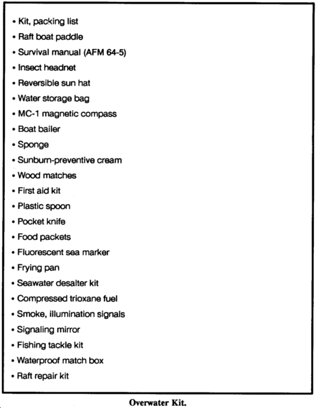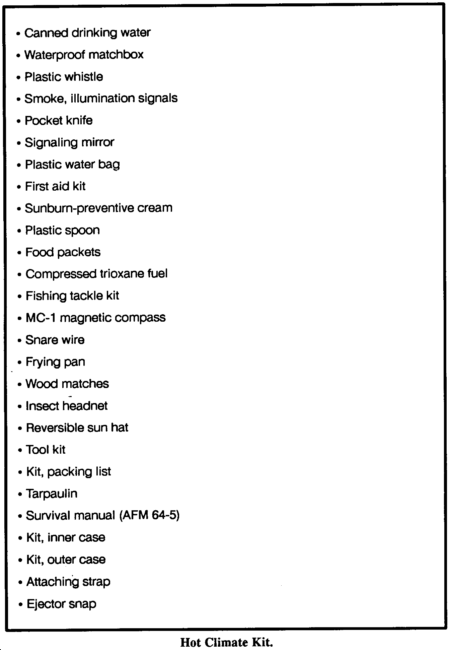 The Army has several basic survival kits, primarily for issue to aviators. There are kits for cold climates, hot climates, and overwater. There is also an individual survival kit with general packet and medical packet. The cold climate, hot climate, and overwater kits are in canvas carrying bags. These kits are normally stowed in the helicopter's cargo/passenger area.