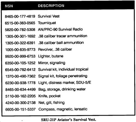 An aviator's survival vest (SRU-21P), worn by helicopter crews, also contains survival items.