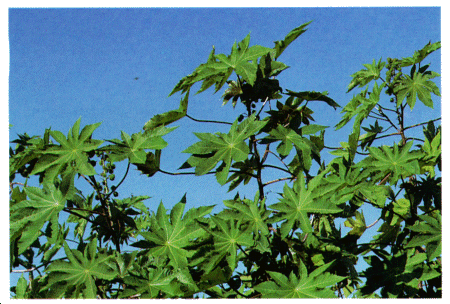 Description: The castor bean is a semiwoody plant with large, alternate, starlike leaves that grows as a tree in tropical regions and as an annual in temperate regions. Its flowers are very small and inconspicuous. Its fruits grow in clusters at the tops of the plants.