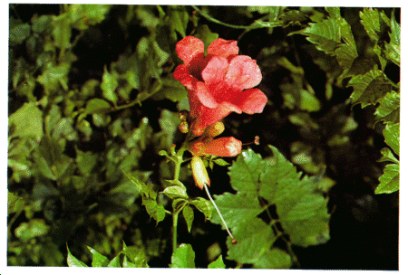 Description: This woody vine may climb to 15 meters high. It has pealike fruit capsules. The leaves are pinnately compound, 7 to 11 toothed leaves per leaf stock. The trumpet-shaped flowers are orange to scarlet in color.
