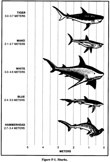 Sharks are potentially the most dangerous fish that attack people. The obvious danger of sharks is that they are capable of seriously maiming or killing you with their bite. Of the many shark species, only a relative few are dangerous. Of these, four species are responsible for most cases of shark attacks on humans. These are the white, tiger, hammerhead, and blue sharks. There are also records of attacks by ground, gray nurse, and mako sharks. See Figure F-1 for illustrations of sharks.