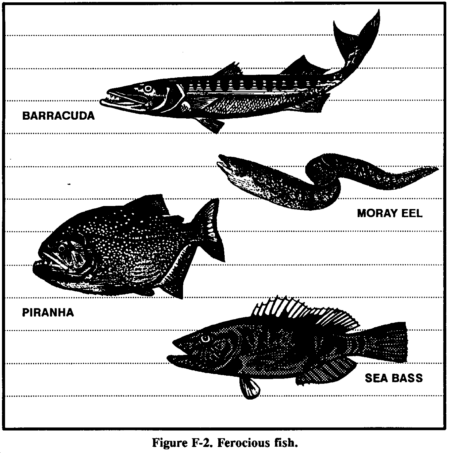 In salt water, other ferocious fish include the barracuda, sea bass, and moray eel (Figure F-2). The sea bass is usually an open water fish. It is dangerous due to its large size. It can remove large pieces of flesh from a human. Barracudas and moray eels have been known to attack man and inflict vicious bites. Be careful of these two species when near reefs and in shallow water. Moray eels are very aggressive when disturbed.