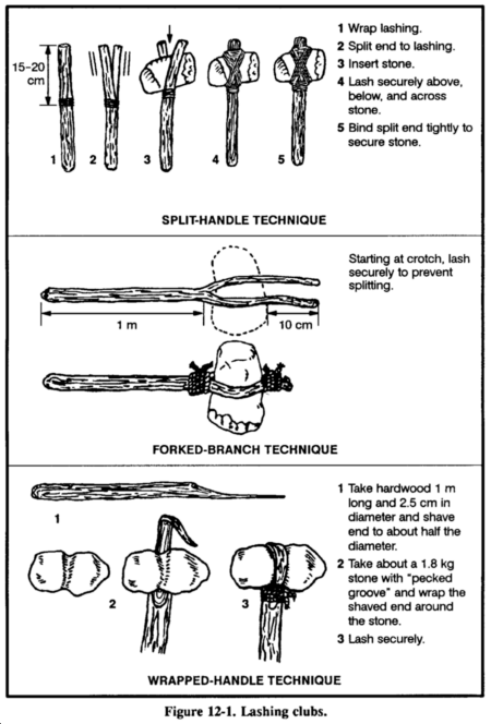 There are three techniques for lashing the stone to the handle: split handle, forked branch, and wrapped handle. The technique you use will depend on the type of handle you choose. See Figure 12-1.