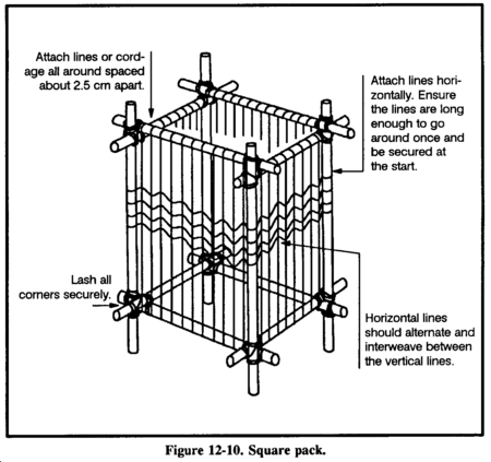 This pack is easy to construct if rope or cordage is available. Otherwise, you must first make cordage. To make this pack, construct a square frame from bamboo, limbs, or sticks. Size will vary for each person and the amount of equipment carried (Figure 12-10).