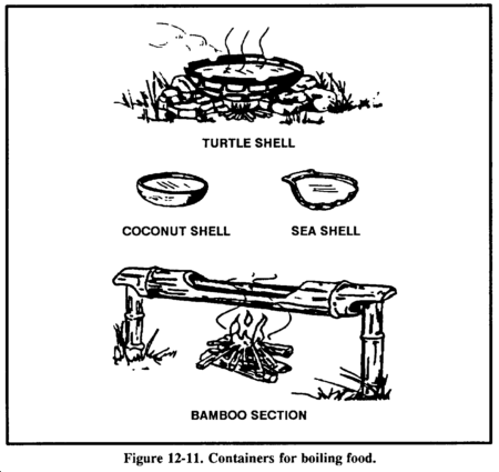 To use turtle shells, first thoroughly boil the upper portion of the shell. Then use it to heat food and water over a flame (Figure 12-11).