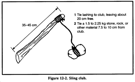 A sling club is another type of weighted club. A weight hangs 8 to 10 centimeters from the handle by a strong, flexible lashing (Figure 12-2). This type of club both extends the user's reach and multiplies the force of the blow.