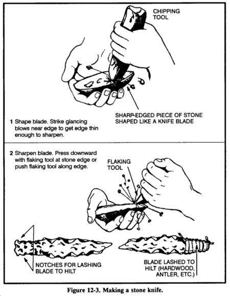 To make a stone knife, you will need a sharp-edged piece of stone, a chipping tool, and a flaking tool. A chipping tool is a light, blunt-edged tool used to break off small pieces of stone. A flaking tool is a pointed tool used to break off thin, flattened pieces of stone. You can make a chipping tool from wood, bone, or metal, and a flaking tool from bone, antler tines, or soft iron (Figure 12-3).