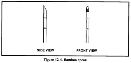 To make spears, use the same procedures to make the blade that you used to make a knife blade. Then select a shaft (a straight sapling) 1.2 to 1.5 meters long. The length should allow you to handle the spear easily and effectively. Attach the spear blade to the shaft using lashing. The preferred method is to split the handle, insert the blade, then wrap or lash it tightly. You can use other materials without adding a blade. Select a 1.2-to 1.5-meter long straight hardwood shaft and shave one end to a point. If possible, fire harden the point. Bamboo also makes an excellent spear. Select a piece 1.2 to 1.5 meters long. Starting 8 to 10 centimeters back from the end used as the point, shave down the end at a 45-degree angle (Figure 12-4). Remember, to sharpen the edges, shave only the inner portion.
