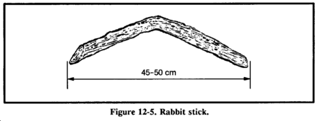 The throwing stick, commonly known as the rabbit stick, is very effective against small game (squirrels, chipmunks, and rabbits). The rabbit stick itself is a blunt stick, naturally curved at about a 45-degree angle. Select a stick with the desired angle from heavy hardwood such as oak. Shave off two opposite sides so that the stick is flat like a boomerang (Figure 12-5). You must practice the throwing technique for accuracy and speed. First, align the target by extending the nonthrowing arm in line with the mid to lower section of the target. Slowly and repeatedly raise the throwing arm up and back until the throwing stick crosses the back at about a 45-degree angle or is in line with the nonthrowing hip. Bring the throwing arm forward until it is just slightly above and parallel to the nonthrowing arm. This will be the throwing stick's release point. Practice slowly and repeatedly to attain accuracy.